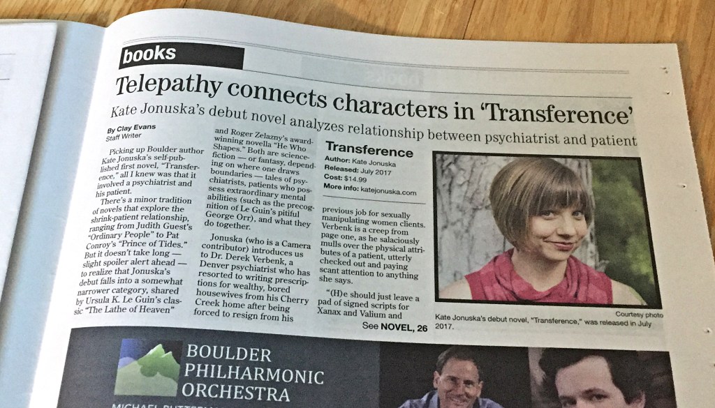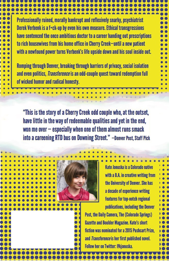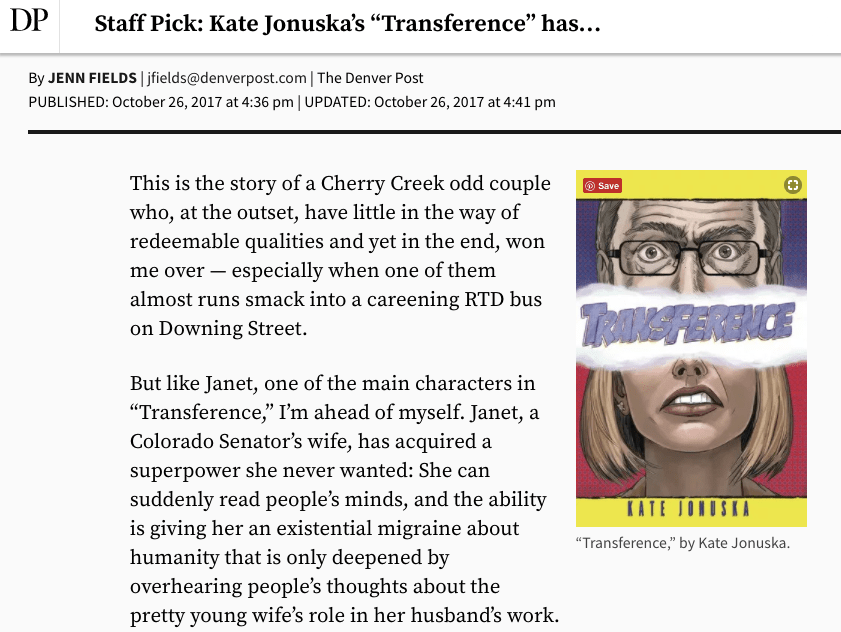 - The Denver Post (staff pick): “Transference has delightfully despicable characters who earn their laughs… Jonuska (who has written for The Denver Post in the past) has laid fertile ground for comedy with the mind-reading premise. Those comic twists and turns — some predictable, others surprising — endear Janet and Verbenk to the reader and, eventually, to one another.” – Jenn Fields
