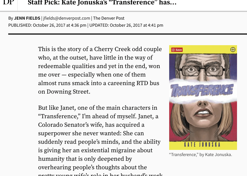 My novel Transference was chosen as a Staff Pick over at the Denver Post and was featured with the headline: Kate Jonuska’s “Transference” has delightfully despicable characters who earn their laughs I love it! And she very much loved the book, saying it might be “a good place to start a conversation about whether it matters if […]